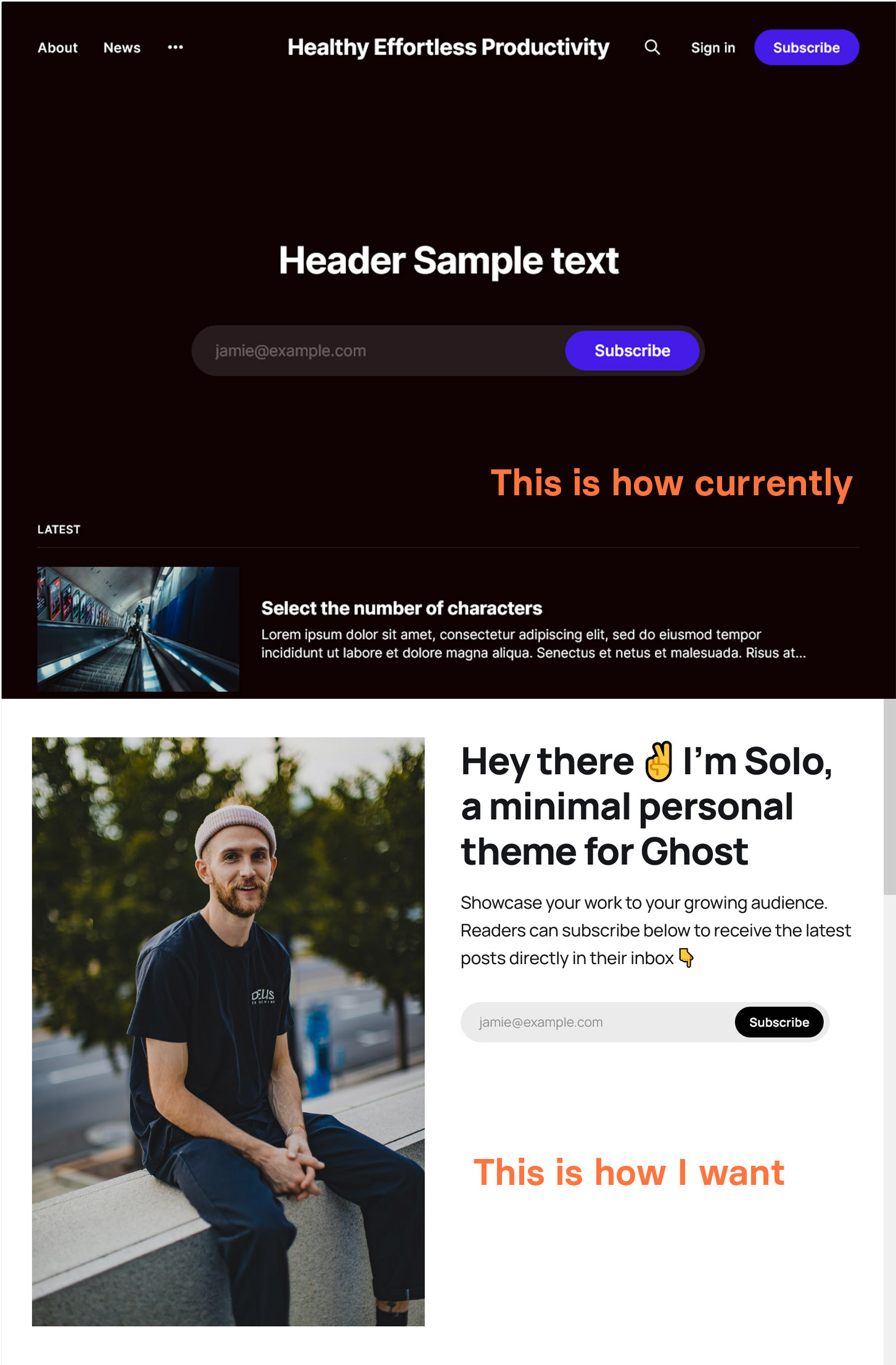 I’m using Ali Abdaals theme, but I would prefer to use the free Ghost Source theme, as I find it more appealing. However, I’m unsure how to create a split landing page featuring an image and an email sign-up section. Could anybody help me with that?