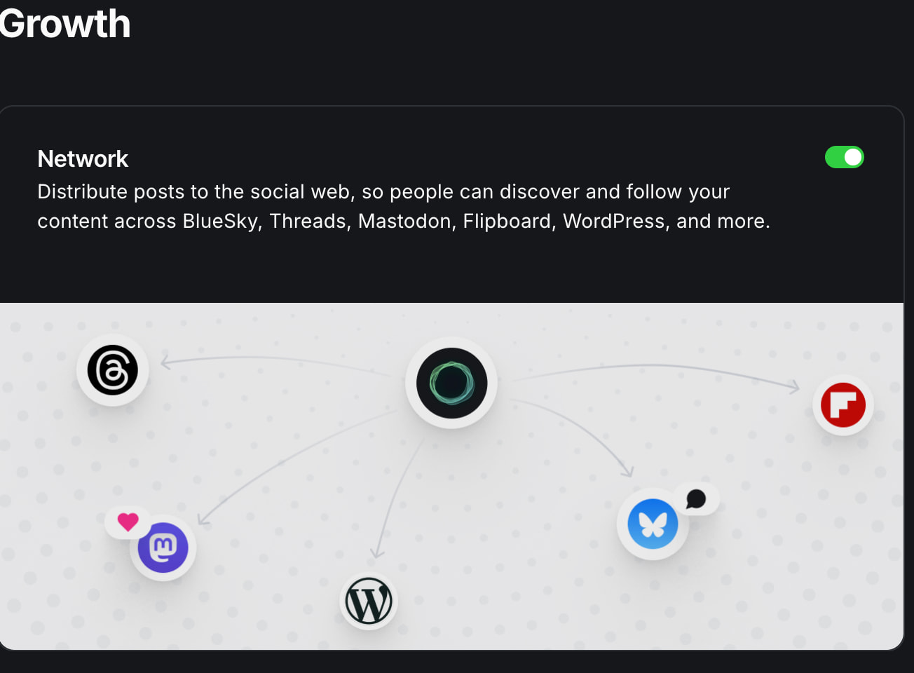 The Network toggle causes your Ghost site to behave as a Fediverse account, and to be able to share content to and interact with other sites that run ActivityPub/AT protocol, meaning Loops, Mastodon, Bluesky, Threads, Lemmy, PeerTube, some WP sites (with plugin), etc, with varying levels of support. It doesn’t support adding an external account.