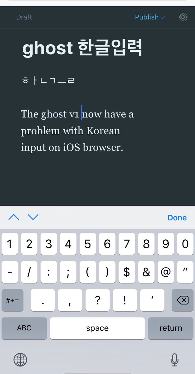 You are right, I’ve tried with Safari and Chrome on an iPhone, and typing in the mobile Ghost editor it gives ㅎㅏㄴ instead of 한 . It looks like the mobile editor is not yet ready for Korean input.