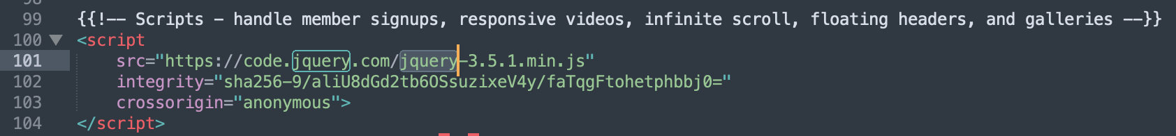 It looks like the theme loads jQuery in default.hbs at line 100: